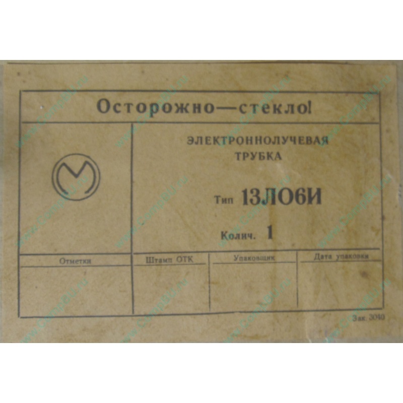 Осциллографическая электронно-лучевая трубка 13ЛО6И с экраном круглой формы с плоской поверхностью. Для визуального наблюдения электрических процессов. Цвет свечения экрана 13ЛО6И - зелёный. Среднее время послесвечения. Диаметр рабочей части экрана 108 мм.